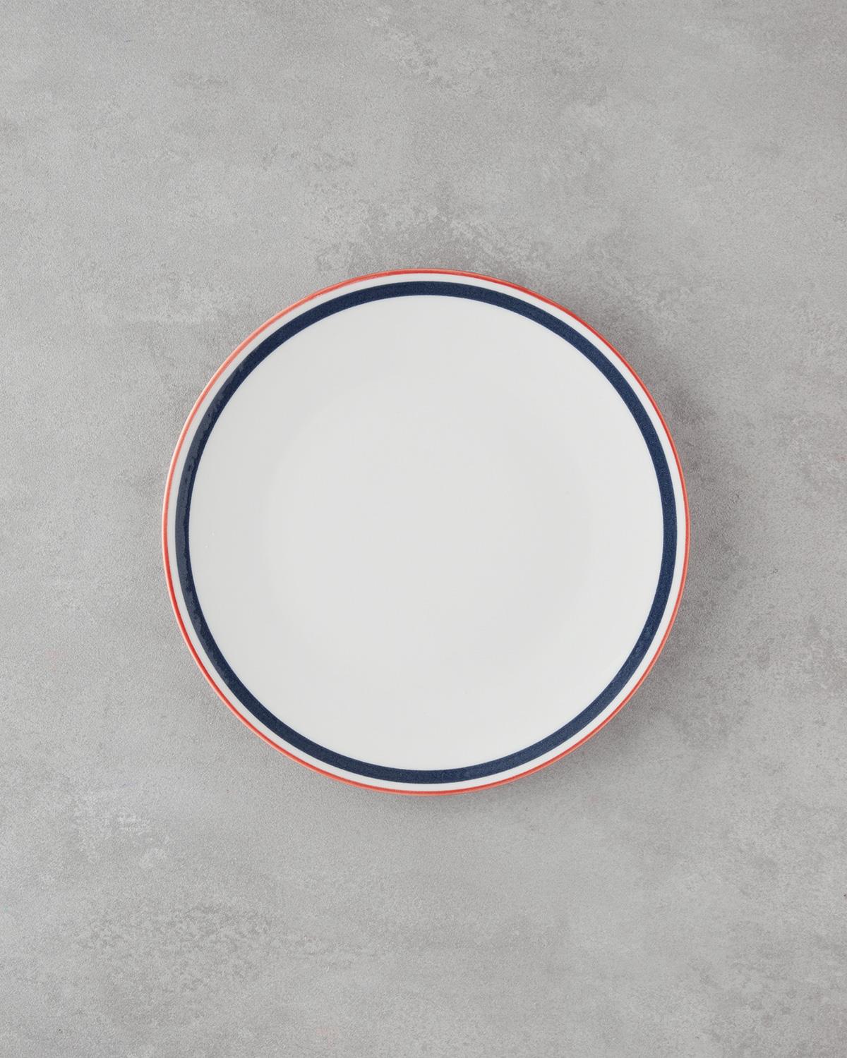 Fanciful Bone porselen servis tabağı, lacivert ve kırmızı renkleriyle sofrana dinamik bir hava katıyor. 25 cm genişliğiyle ana yemeklerden mezeye kadar her türlü sunuma uygun.